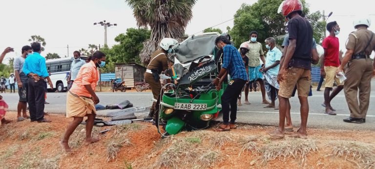 ஒரே திசையில் பயணித்த பேருந்தின் முன் சென்ற முச்சக்கரவண்டி சடுதியாக வீதியின் குறுக்காக திரும்பி கிராமத்துக்கு செல்ல முற்பட்டவேளை பேருந்து மோதியுள்ளது.