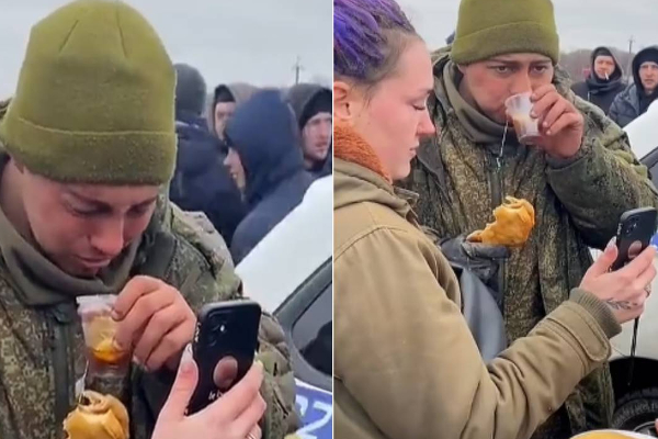 ஒரு பெண் மொபைலைப் பிடித்துக்கொள்ள, ஒரு கையில் தேநீரும், மறு கையில் ஒரு உணவுப்பண்டமும் வைத்திருக்கும் அந்த ரஷ்ய வீரர், மொபைலில் தன் தாயைக் கண்டதும் கண்ணீர் விட்டுக் கதறுகிறார்.
