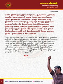 இலங்கையில் ஏற்பட்டுள்ள பொருளாதார நெருக்கடி காரணமாக மக்கள் புரட்சி வெடித்துள்ளதை அடுத்து, இனப்படுகொலையாளிகளான ராஜபக்ச சகோதரர்கள் உட்பட அந்நாட்டின் ஆட்சியாளர்கள் ஓட ஓட விரட்டப்பட்டு வருகின்றனர். அவர்களின் வீடுகள் உட்பட உடமைகள் தீயிட்டு கொளுத்தப்படும் காட்சிகள் நாள்தோறும் வெளியாகி வருகின்றன எனவும் சீமான் கூறியுள்ளார்.