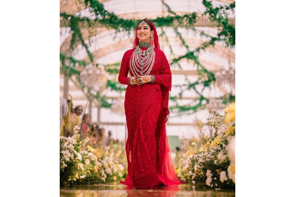 வெர்மில்லியன் ரெட் நிறத்தில் லெஹங்கா போன்ற வடிவமைப்பில் நயன்தாராவின் திருமண புடவையை வடிவமைத்தவர் மோனிகா ஷா.