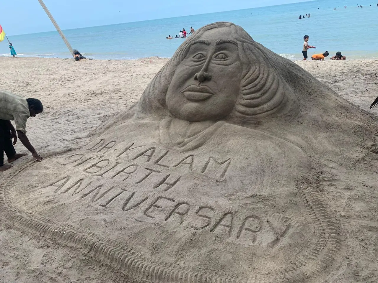 அப்துல் கலாமின் 91ஆவது பிறந்த தின நிகழ்வு இன்று யாழில் நடைபெற்ற நிலையில் வேலணையை சேர்ந்த மணல் சிற்ப கலைஞர் சுப்பிரமணியம் சுகுமாரால் கலாமின் மணல் சிற்பம் உருவாக்கப்பட்டுள்ளது.