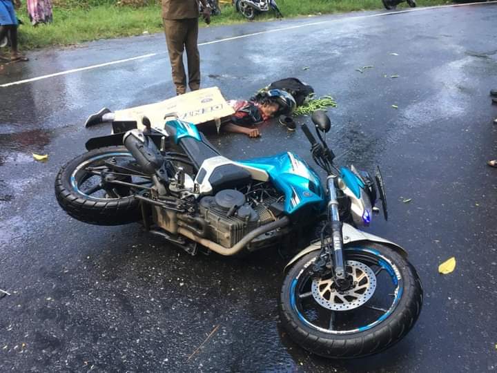 மோட்டார் சைக்களில் வந்தவர் வழுக்கிச்சென்று, லொறியின் பின்பகுதி சிக்கில் சிக்குண்டார் என தெரியவந்துள்ளது.