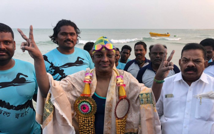 இந்நிலையில், பல்வேறு நீச்சல்போட்டிகளில் சாதனை படைத்த தெலுங்கானா மாநிலம் ஹைதராபாத்தைச் சேர்ந்த சியாமளா கோலி (வயது-48), தலைமன்னாரில் இருந்து தனுஸ்கோடி வரையிலான சுமார் 30 கி.மீ. தூரம் கொண்ட பாக் ஜலசந்தி கடற்பகுதியை நீந்தி சாதனை படைத்தார்.