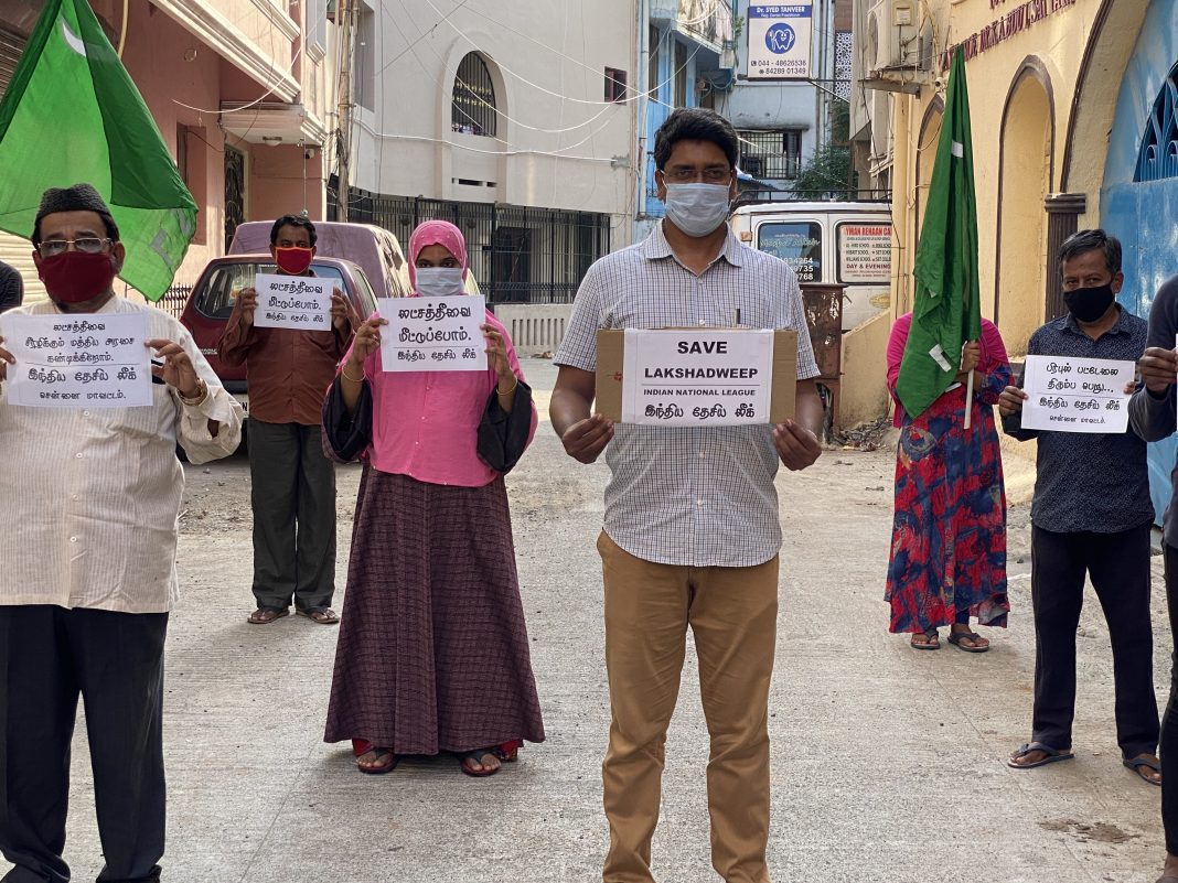 லட்சத்தீவில் நடைபெற்று வரும் அநீதிகளுக்கு எதிராக மத்திய மோடி அரசை கண்டித்தும், லட்சத்தீவை காக்கும் பொருட்டும், இந்திய தேசிய லீக் சார்பில் இணைய வழி போராட்டம் தமிழகம் முழுவதும் நடைபெற்றது. இந்த போராட்டத்திற்கு இந்திய தேசிய லீக் இளைஞரணி தேசிய பொது செயலாளர் சையத் சாதான் அஹமது தலைமை தாங்கினார்.