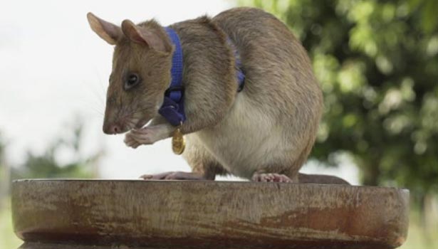 கம்போடியாவில் வெடிகுண்டுகளைக் கண்டுபிடிக்க 7 வயதான ஆப்பிரிக்க எலி பயிற்சி பெற்று இருந்தது. இதன் மூலம் 2 லட்சத்து 25 ஆயிரம் சதுர மீட்டர் பரப்பளவில் வெடிகுண்டுகளை நுகர்ந்து கண்டுபிடிக்கும் திறன்கொண்டது.