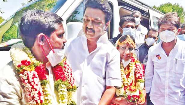 மணக்கோலத்தில் நின்ற ஜோடியை கண்டதும் மு.க.ஸ்டாலின் தனது காரை நிறுத்தி மணமக்களை அழைத்து பேசினார். அப்போது அந்த ஜோடியினர், உங்கள் தலைமையில் எங்கள் திருமணம் நடைபெற வேண்டும் என்ற எதிர்பார்ப்புடன் காத்திருக்கிறோம் என்று தெரிவித்தனர்.