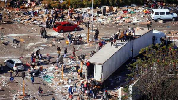 டர்பனில் அயோபா குளிர் சேமிப்பு கிடங்களை ஒரு பெரும் வன்முறை கூட்டம் சூழ்ந்துள்ளது. இதையும், டர்பனில் உள்ள ஸ்பிரிங்ஃபீல்ட் சில்லறை விற்பனை மையத்தில் கொள்ளையடிக்கப்படுவதையும் சாட்டிலைட் படங்கள் அம்பலப்படுத்தியுள்ளன. பீட்டர்மரிட்ஸ்பர்க்கின் ப்ரூக்ஸைடு மால் கொள்ளையடிக்கப்பட்டு எரிக்கப்பட்டது. பீட்டர்மரிட்ஸ்பர்க்கில் உணவுக்காக மக்கள் நீண்ட வரிசையில் காத்திருந்தார்கள். இது அத்தனையும் சாட்டிலைட் படங்களாக வெளியாகி உலகை உறைய வைத்துள்ளன.