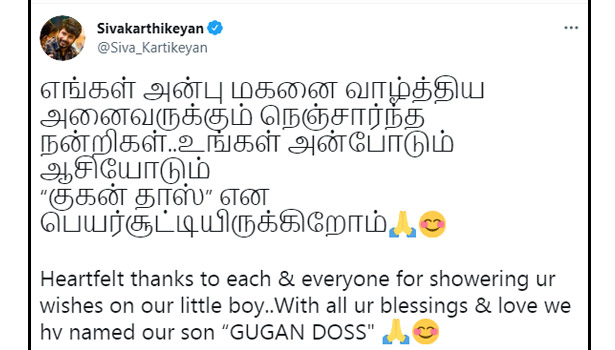 இந்நிலையில், நடிகர் சிவகார்த்திகேயன் தனது மகனுக்கு ‘குகன் தாஸ்’ என பெயர் சூட்டி இருப்பதாக தனது சமூக வலைதள பக்கத்தில் தெரிவித்துள்ளார். தனது மகனை வாழ்த்திய அனைவருக்கும் நெஞ்சார்ந்த நன்றிகள் என அந்த பதிவில் அவர் குறிப்பிட்டுள்ளார். மேலும் மகனின் நெற்றியில் முத்தமிட்டபடி இருக்கும் புகைப்படத்தையும் பதிவிட்டுள்ளார் சிவகார்த்திகேயன். இந்த புகைப்படம் சமூக வலைதளங்களில் வைரலாகி வருகிறது.