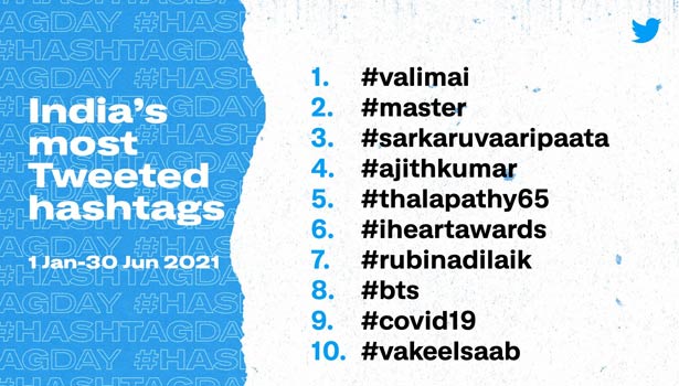 ஹேஷ்டேக் தினமான இன்று, இந்தியளவில் இந்தாண்டு ஜனவரி 1 முதல் ஜூன் 30-ந் தேதி வரை அதிகம் பயன்படுத்தப்பட்ட ஹேஷ்டேக் பட்டியலை டுவிட்டர் நிறுவனம் வெளியிட்டுள்ளது. அந்த பட்டியலில் அஜித்தின் ‘வலிமை’ படத்திற்காக பயன்படுத்தப்பட்ட #Valimai முதலிடத்தை பிடித்துள்ளது. விஜய்யின் மாஸ்டர் பட ஹேஷ்டேக்கான #master இரண்டாவது இடத்தை பிடித்துள்ளது. வலிமை ஹேஷ்டேக் முதலிடம் பிடித்துள்ளதை அஜித் ரசிகர்கள் கொண்டாடி வருகின்றனர்.