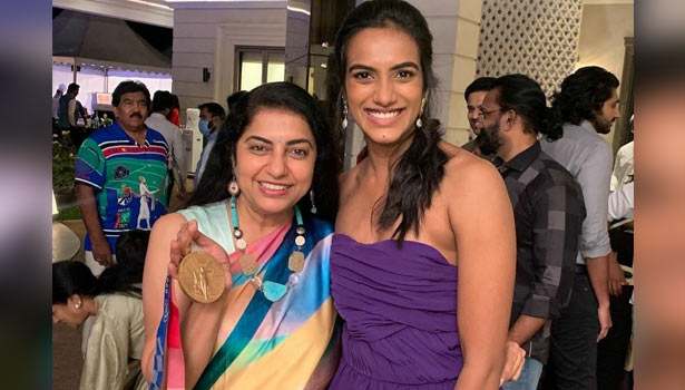 குறிப்பாக தமிழ் நடிகைகள் ராதிகா சரத்குமார், சுகாசினி மணிரத்னம் ஆகியோர் இந்த நிகழ்வில் கலந்துகொண்டு பி.வி.சிந்துவுக்கு தங்களது வாழ்த்துக்களை தெரிவித்ததுடன், ஒலிம்பிக்கில் அவர் வாங்கிய வெண்கலப் பதக்கத்தை கையில் வைத்துக்கொண்டு சிந்துவுடன் புகைப்படமும் எடுத்துக் கொண்டார்கள். இந்த புகைப்படங்கள் தற்போது சமூக வலைதளங்களில் வைரலாகி வருகின்றன.